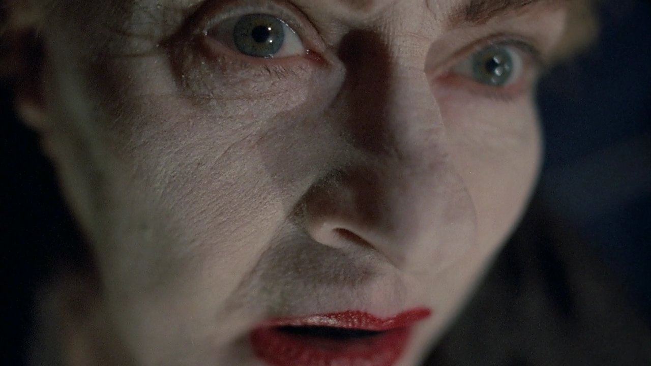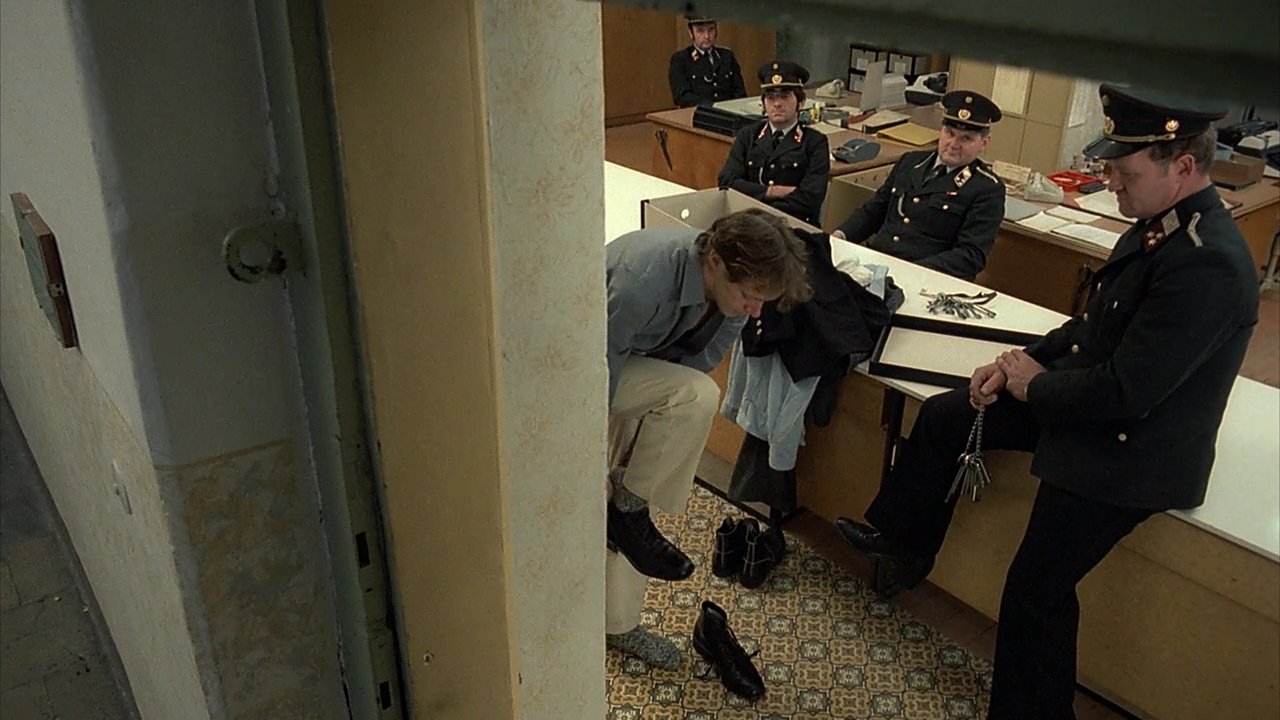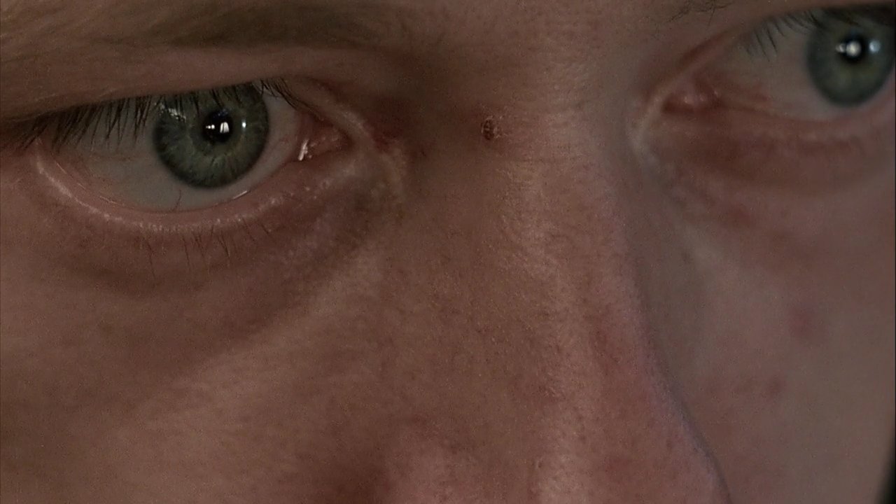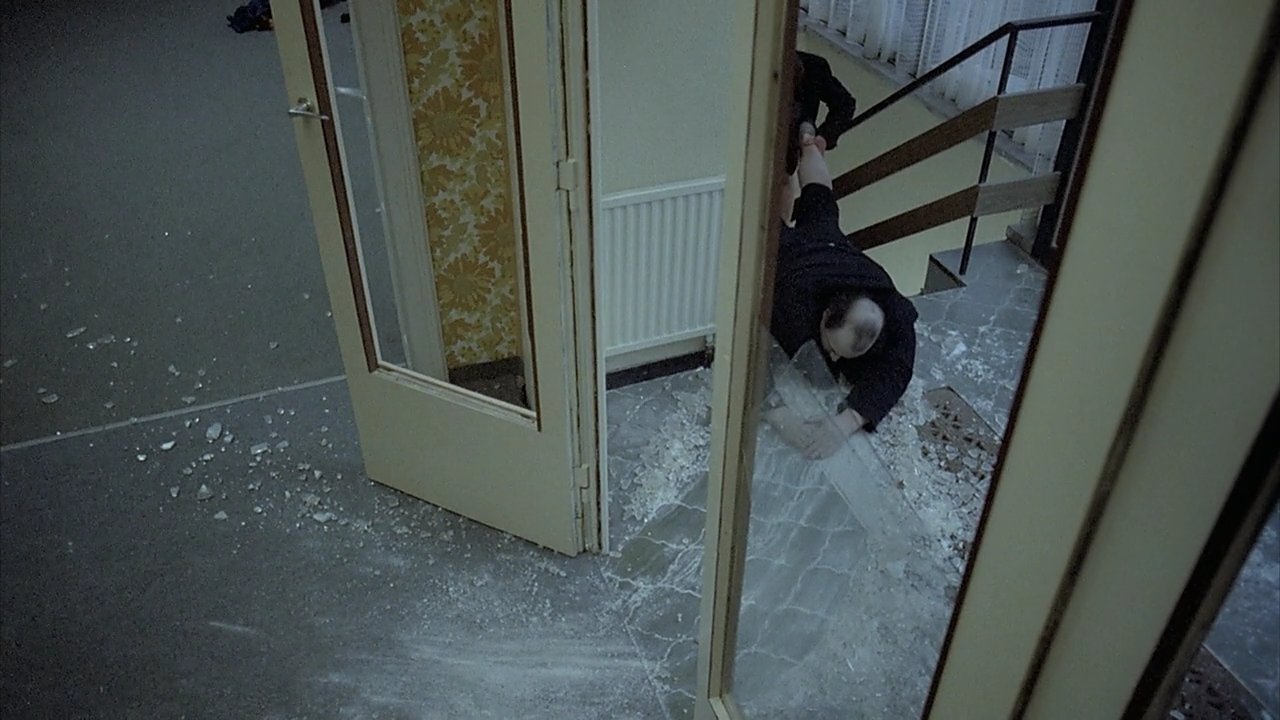 Évidemment, la première chose qui choque, ce qui nous est infligé en gros plan dès les premières secondes (après le premier quart d'heure d'exposition psychologique sous forme de récit-photo express), c'est le visage ultra-anguleux de Erwin Leder en excellent candidat au titre de psychopathe le plus flippant. Qu'il paraît loin le temps de son interprétation d'un sous-marinier dans le Das Boot de Wolfgang Petersen... alors que seulement une année séparent les deux films. Il faut dire que le travail de mise en scène et de photographie (Zbigniew Rybczynski) tourne à plein régime pour nous alimenter en plans improbables, soit par des angles et des cadrages biscornus et inhabituels, soit par le recours à la snorricam (j'ai découvert le terme en cherchant comme avaient été prises certaines images très proches en contre-plongée), un appareillage fixé directement face à l'acteur — voire au-dessus avec ajout d'un miroir au niveau du ventre de l'acteur pour obtenir la contre-plongée en plongée.